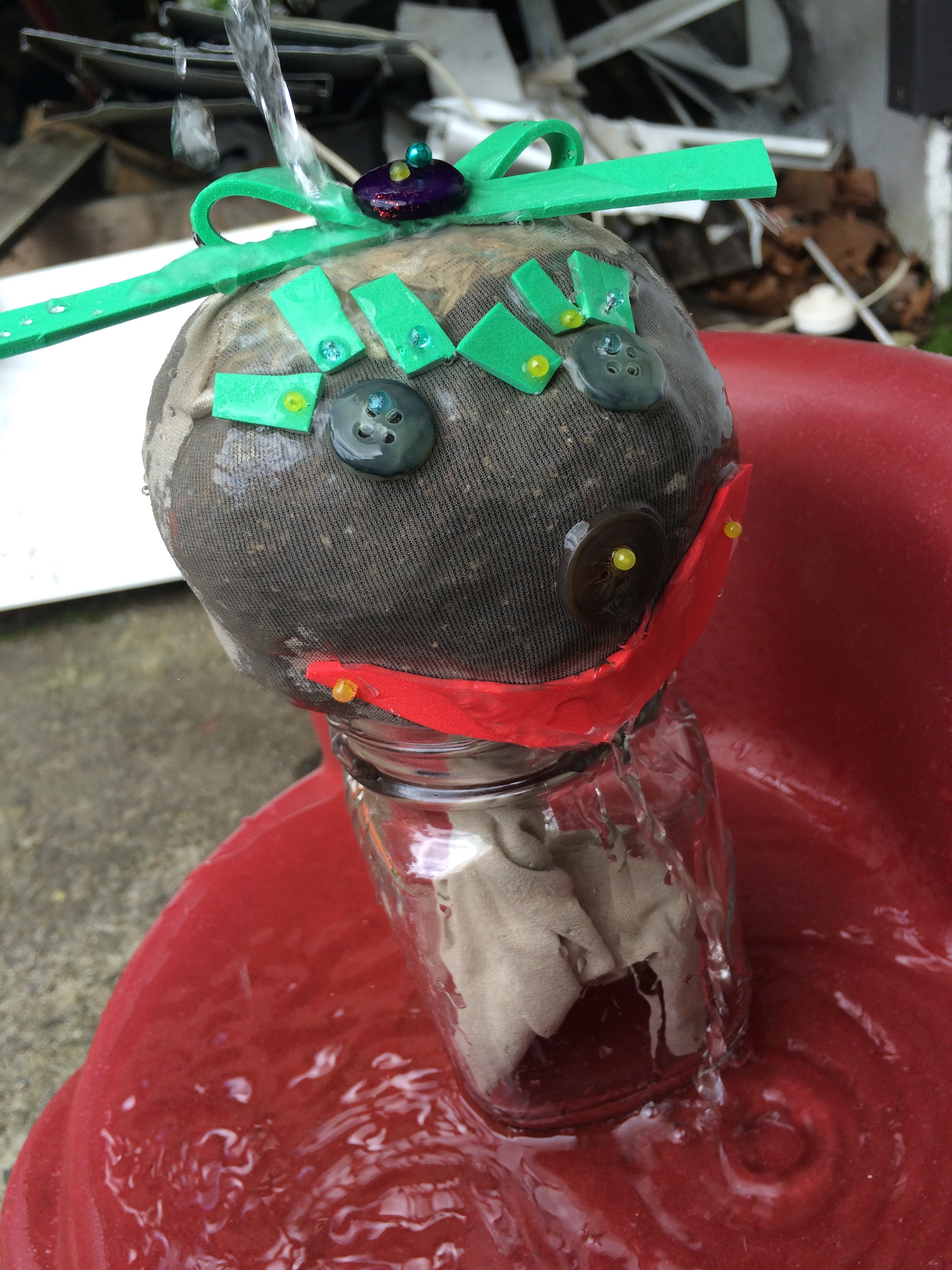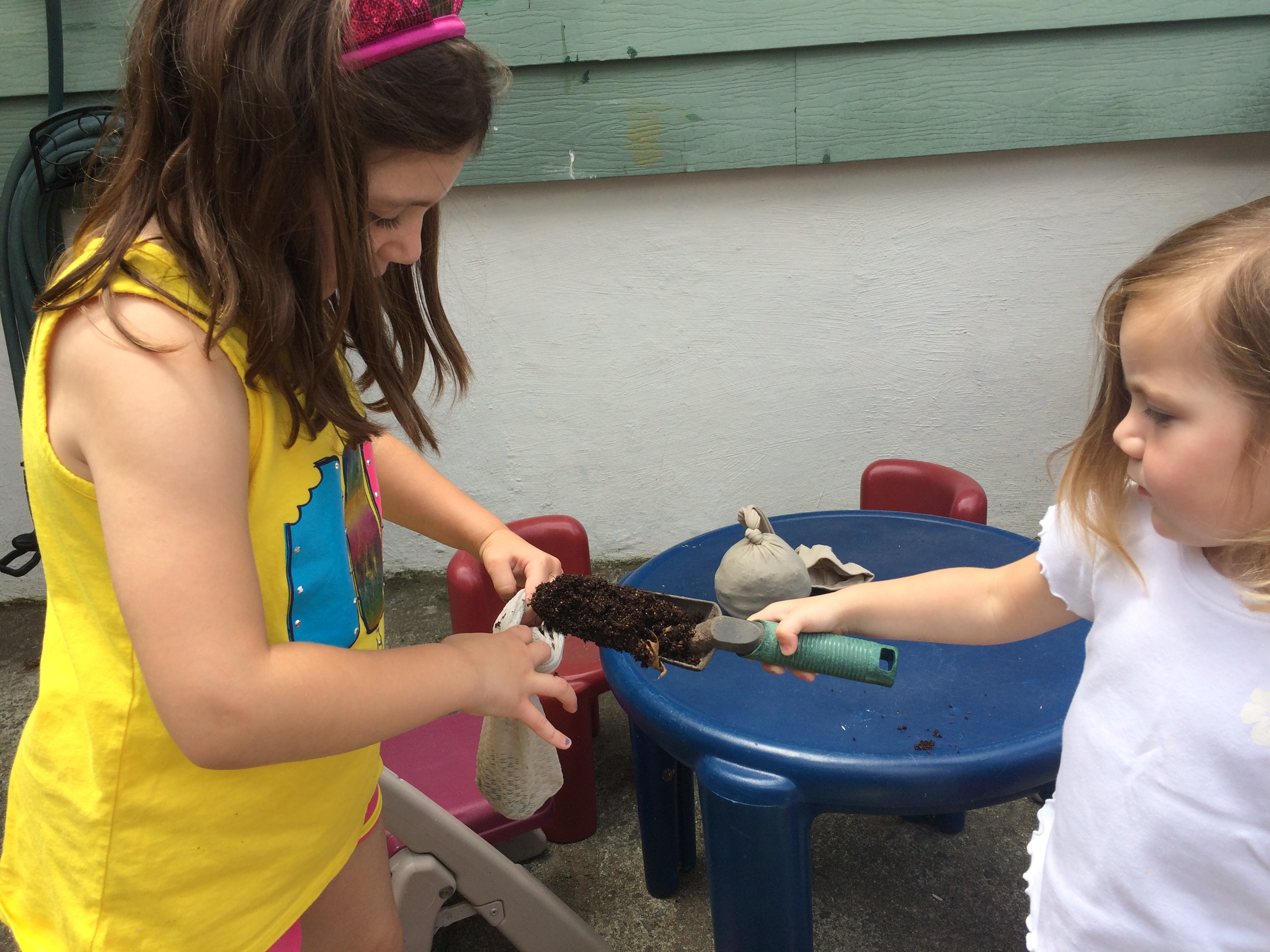 3. Put lots of dirt inside.  It’s easier if one kid holds the stocking open a bit for this part.  Keep pushing the dirt down and so it looks like a round head shape, you could mold it a bit.